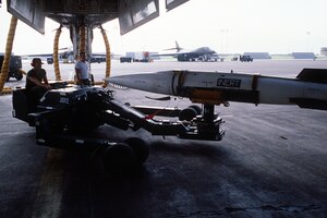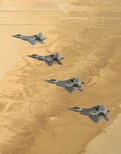 Four F/A-22 Raptors flew a four-ship formation, a first for the new fighter. The formation was part of a flight test of the Intra-Flight Data Link, a data transmitter designed to let Raptor pilots share flight information with other aircrews automatically, without using radio communications. Three