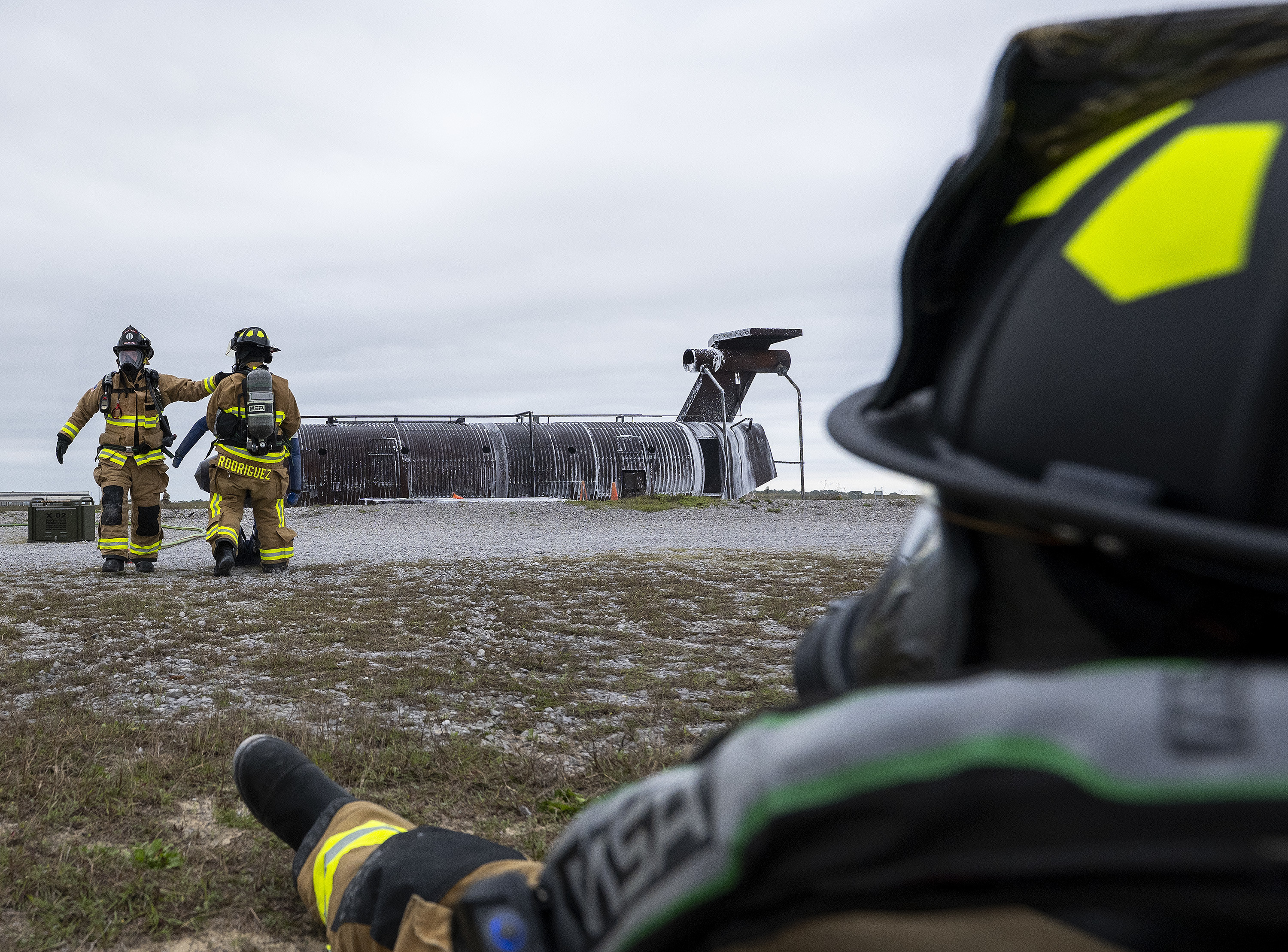Firefighters responded to a simulated aircraft crash in a contested environment extinguishing the fire using F3 foam and performing victim rescue operations.