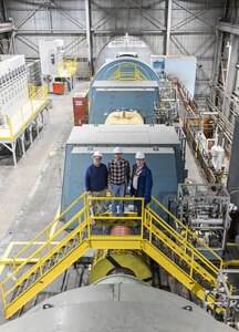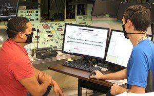 Seven Hroncich, left, an instrument technician, Robert Bradford, center right, an electrician, Kevin Thompson, right, test operations engineer, Tim Mullins, an outside machinist, and others prepare for a test run in the Arnold Engineering Development Complex (AEDC) Arcs Test Facility Control Room,
